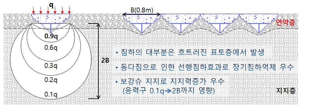 보강슈 지지로 지지력증가 우수 (응력구 0.1q 2B까지 영향)